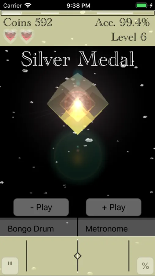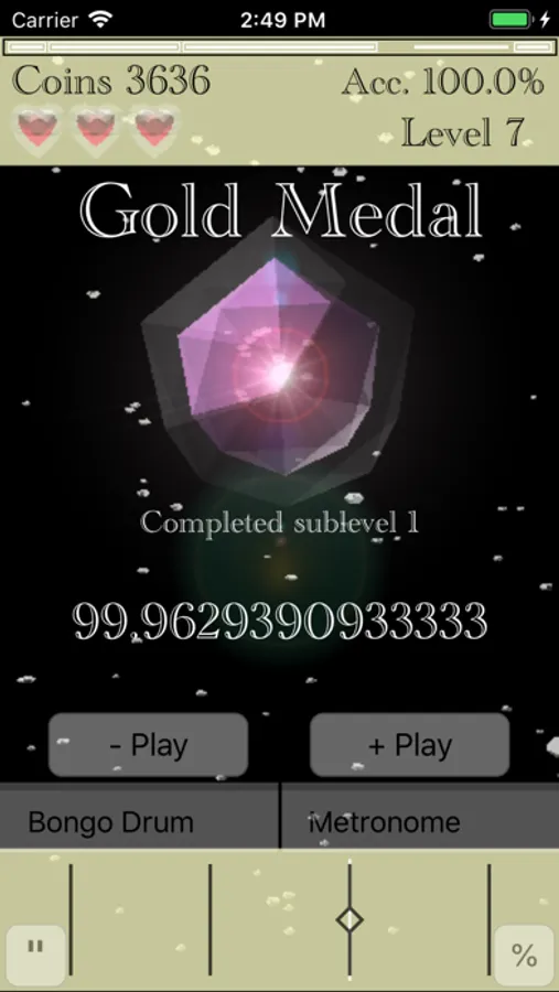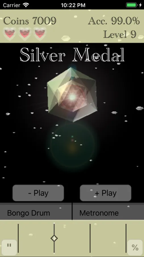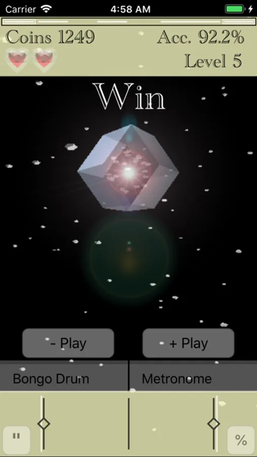 You are a gem hunter mining for precious light-note gems. With your hand-held instrument you can form gems in strange regions of space by replicating the timing of light pulses, filling the voids with light-notes. The gravity of the light-notes will crystallize space matter into a light-filled gem. A flawless rhythm gem will retain all of the light notes you send it. The accuracy of your timing will determine the value of the gem, earning you coins. Use coin credits in the space vending machine to upgrade your instruments and sounds. As you advance in levels you can find new rare gems.