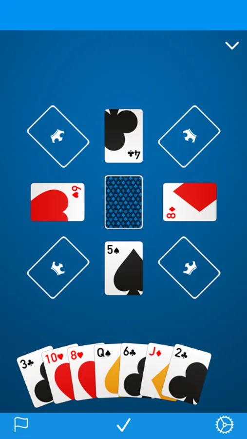 The deck is set up with 8 spaces around the deck; four king spaces (marked with a crown) and four unmarked spaces. You'll get a new card at the beginning of every turn, and the goal of the game is to get rid of your cards first by making as many of the following types of moves as possible: