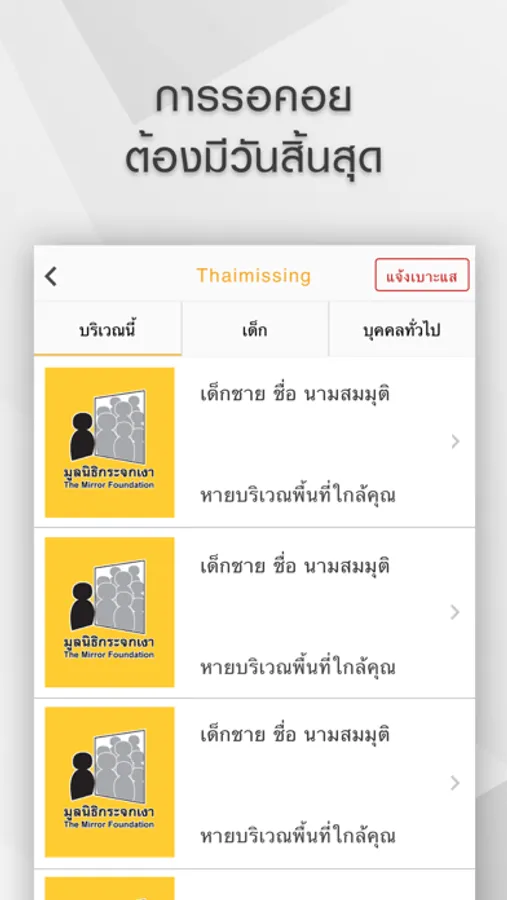 ศูนย์ข้อมูลคนหาย มูลนิธิกระจกเงา องค์กรพัฒนาเอกชน ที่ทำหน้าที่ช่วยเหลือติดตามคนหายให้กลับคืนสู่ครอบครัวอย่างปลอดภัย พร้อมผลักดันให้ปัญหาคนหาย ไม่ถูกตีค่าเป็นเพียงปัญหาของครอบครัวใดครอบครัวหนึ่งเท่านั้น แต่เป็นปัญหาของสังคมที่ทุกคนควรมีส่วนร่วมในการพาคนหายกลับบ้าน ด้วยความหวังว่า "การรอคอย ต้องมีวันสิ้นสุด"