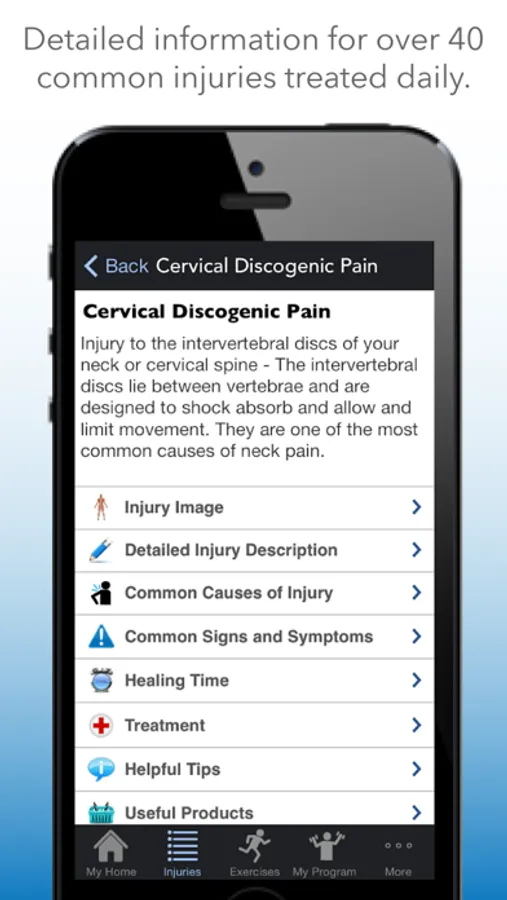 Each and every injury found within the app has a vast amount of vital information that aims to educate and inform users of their specific injury they are suffering from. For each injury you will find: