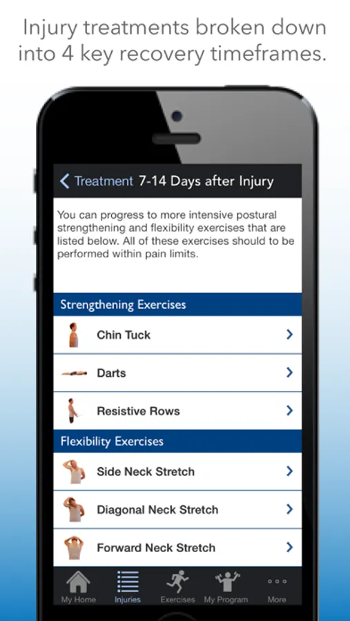 A vast amount of injury specific exercises that help you improve your strength and flexibility during your injury treatment and rehabilitation. All exercises found within the app have retina display images of how to perform the exercises, explanation of the exercise such as reps and sets and the purpose and also detailed written steps. You will also find out the specific and additional muscles that are involved in the exercise. Furthermore you will find "Tips" information that helps you improve the effectiveness of each particular exercise.