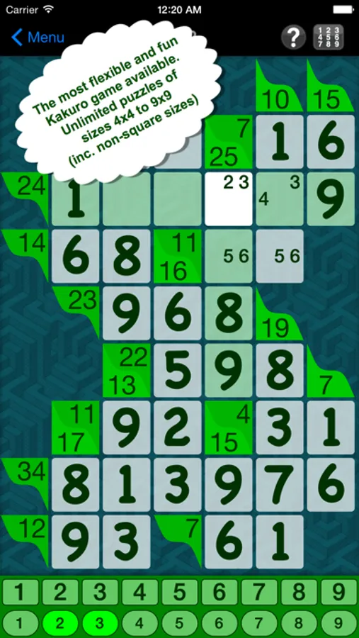 Whether you are new to Kakuro or an experienced player currently using another app, you owe it to yourself to download and try Art of Kakuro. The app was designed to make the experience of playing Kakuro on a mobile device more efficient and enjoyable than anything else available. For example, in other Kakuro apps, adding notes to indicate what digits are possible in a row or column is annoyingly tedious. Art of Kakuro makes this far faster and easier by allowing multiple selections, and by allowing dragging across the number input buttons to enter multiple consecutive digits. As a result, entering notes for a row of three spaces with a sum of 10 takes 2 tap-and-swipe gestures instead of 24 taps. Advantages like these will make other apps seem frustrating once you've used Art of Kakuro!