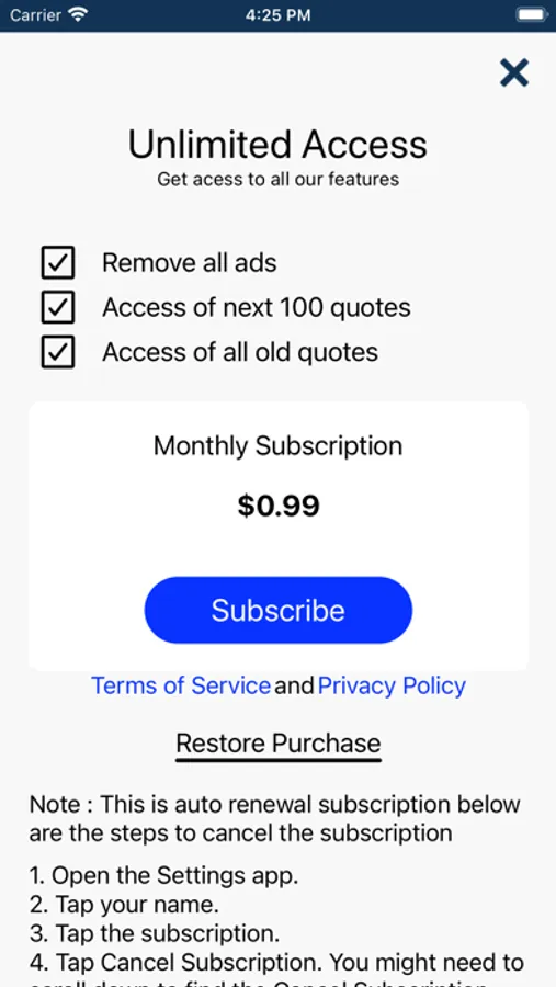 This subscription is valid for 1 Month. Payment will be charged to your iTunes Account at confirmation of purchase. Your subscription automatically renews unless auto-renew is turned off at least 24-hours before the end of the current period. Your account will be charged the price listed at the top of this screen for renewal within 24-hours prior to the end of the current period. Subscriptions may be managed and auto-settings may be turned off by going to the Account Settings screen in the App Store app on your device after purchase. No cancellation of the current subscription is allowed during active subscription period.