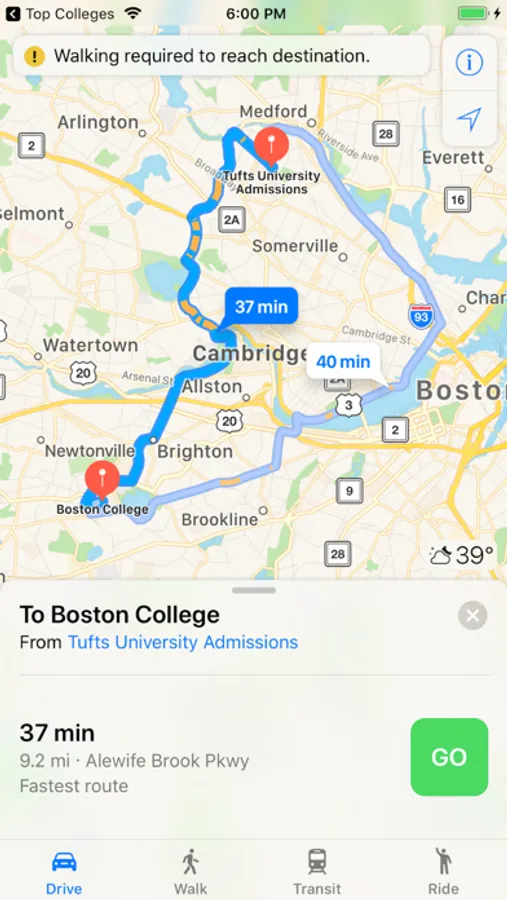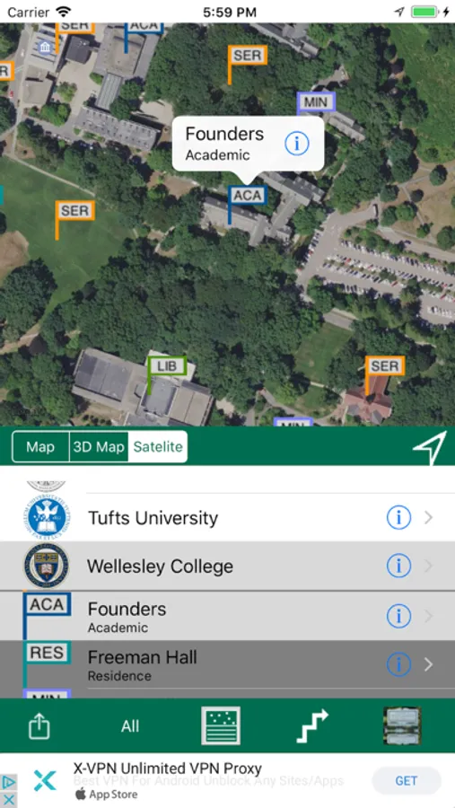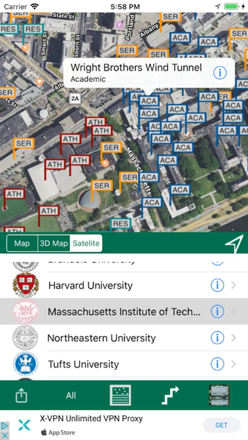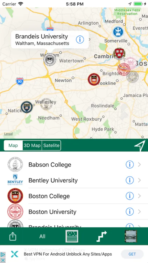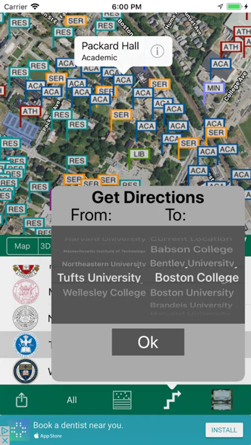 The Boston’s Top Colleges Navigator has each campus mapped out . . . follow the pulsing blue dot as you walk from building to building. Tap on the admissions office flag; the chem building; the soccer field and the app will show you how to get there. Another tap launches applicable web page. Ready to head to the next campus? Simply set the dials and the app displays a map and driving directions to the next admissions office.