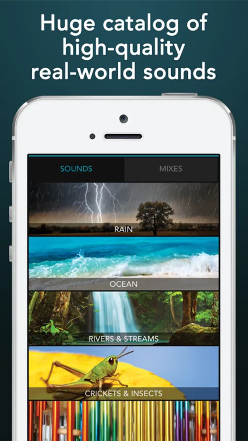 • 19 sound categories, including Rain, Ocean, Rivers & Streams, Crickets & Insects, Frogs, Wind Chimes, Lakes, Wind, Water Fountains, Fire, Birds, Animals, Cars, Trains, Public Places, Household, Bells, Industrial, Soundscapes