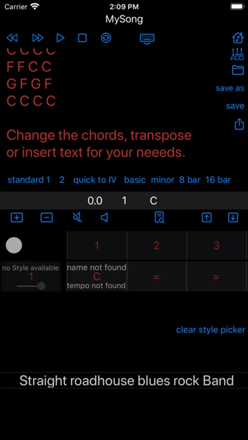 - to play blues - chords of songbooks by a whole band (just type them in or paste the Songtexte with chords into the text- window)