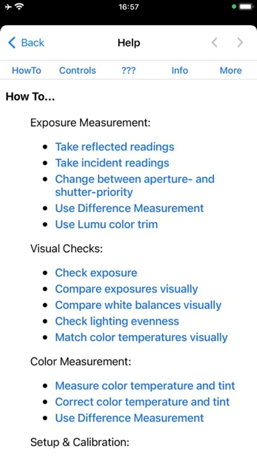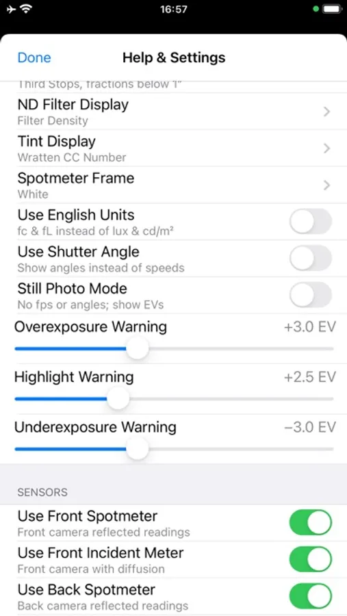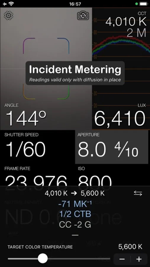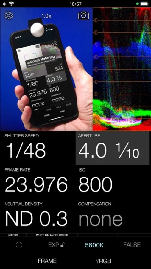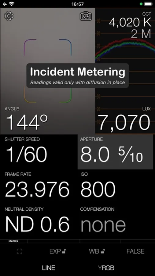 Shutter speeds, apertures, and ISOs shown in Cine Meter II are for metering purposes only and do not control the shutter speed, aperture, and ISO of the iPhone camera. The iPhone camera uses whatever exposure settings it needs to capture a reading. Cine Meter II is a light and color meter only; it is *not* a camera simulator.