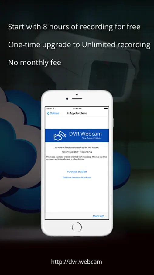 DVR.Webcam: OneDrive Edition is a cloud-based DVR (digital video recorder) app that uses OneDrive as its cloud storage. The app turns your iOS device into a cloud-based surveillance and monitoring tool that will stream and store live video from your device’s camera. Unlike other cloud-based DVR solutions, the app does NOT require monthly fees to store your recording. It simply uses spare storage on your OneDrive.