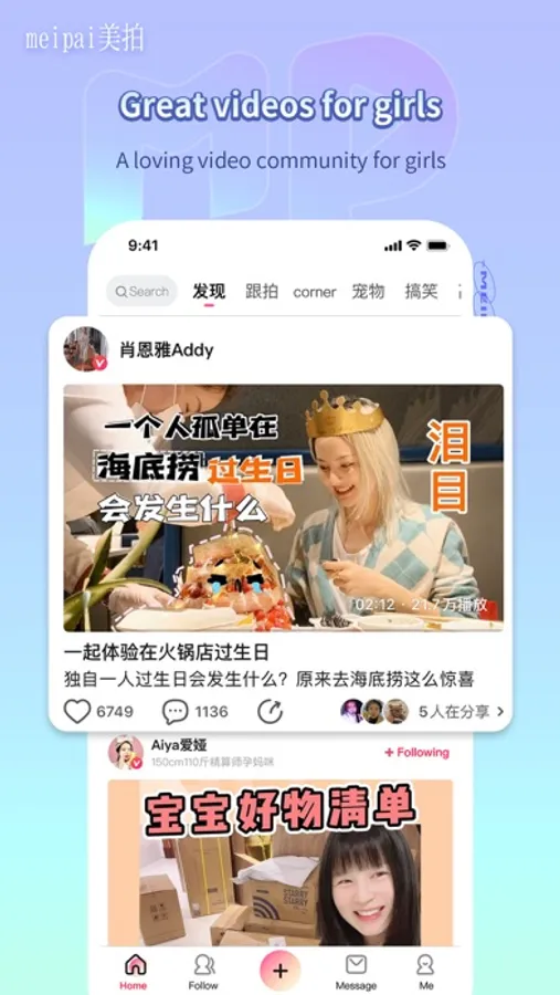 We've prepared lots of topics for our female users so you can easily find friends who have similar tastes and interests on Meipai, including shopping experiences, delicious food, marital isssues, career advice, TV shows, pets, and more!