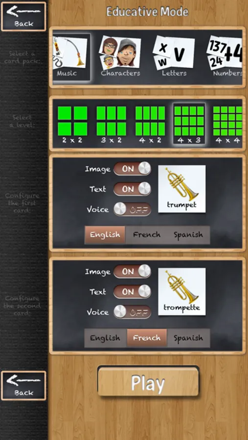 A Two-Player modes is available, and a great Educative mode let you chose the cards images you want to play with, to display or not text below images and to read loud the text with speech synthesis. Moreover, you can learn spanish or french by chosing different languages for first and second card. A really great valuable mode!