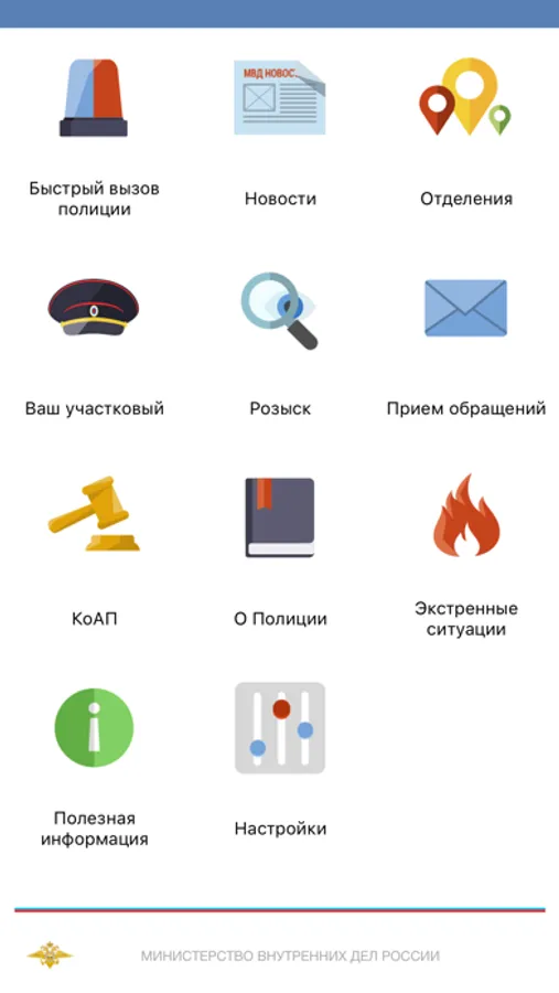 Мобильное приложение позволяет связаться с ближайшим отделом полиции, найти своего участкового уполномоченного полиции, отправить обращение в МВД России, получить справочную информацию о деятельности органов внутренних дел Российской Федерации.