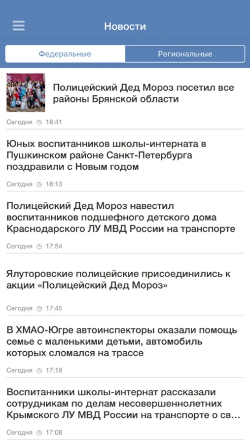 - отображение новостей с официальных интернет-сайтов региональных подразделений МВД России с возможностью публикации новостей в социальные сети.