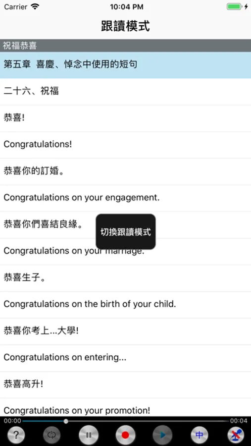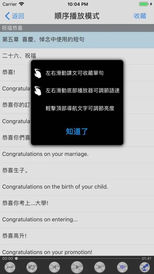 支持单句收藏,单词点译,语速调节,课文点读复读跟读,定时睡眠,耳机线控操作。