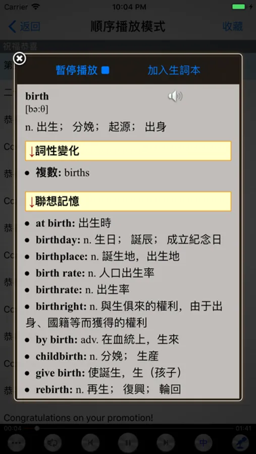 每课都配有详细的中文字幕,并配以强大的可跟读复读的播放器,单词即按即查(联想记忆、常用词组、同义词辨析等),课文内容轻松点读、口语跟读练习、支持后台播放、多种播放学习模式!