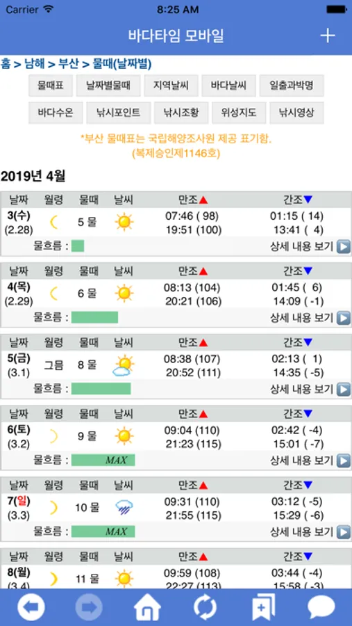 물때 (조석) - 물때표, 조석 예보, 간조, 만조, 월령, 일출/일몰, 월출/월몰, 바다날씨