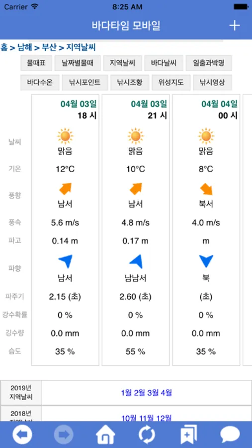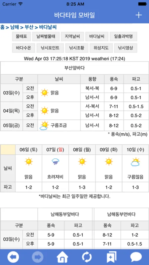바다예보 - 가까운 바다 및 먼바다의 기본적인 날씨정보 및 파고, 풍향, 풍속 정보를 오전 오후로 서비스