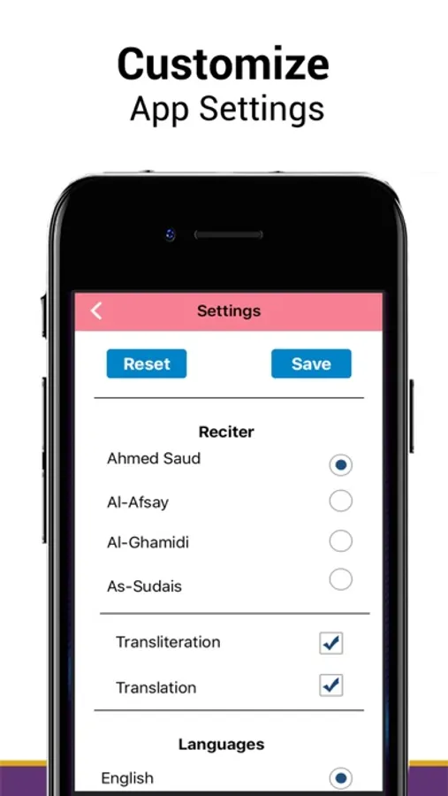 • English translation in 5 different languages as well as transliteration