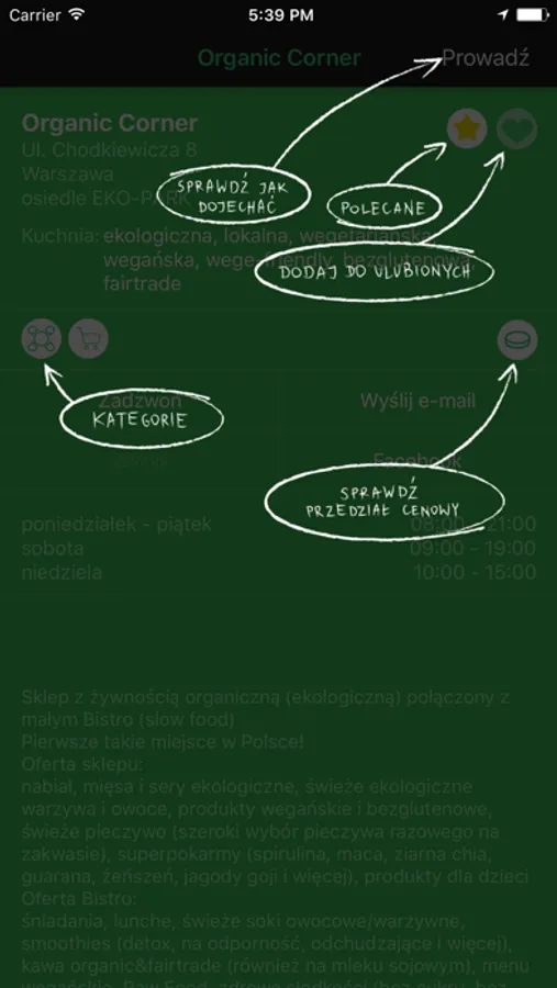 Korzystaj z mapy, żeby łatwo znaleźć interesujące restauracje czy sklepy obok Ciebie. Sprawdzisz godziny otwarcia, dane kontaktowe oraz wskazówki dojazdu. Dodawaj miejsca do ulubionych, a także odwiedzaj miejsca polecane przez GreenLove.