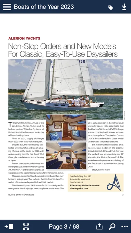 The entire issue is viewable on an iPhone or Android smartphone, tablet, or directly through a web browser. Each page has been optimized for digital viewing. No matter how you choose to read these stories, Boats of the Year will give you a wonderful panorama of the marine industry, as well as a closer look at some of your favorite individual businesses.