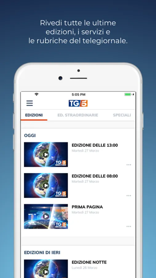 Rivedi tutte le edizioni, i servizi e le rubriche di approfondimento. Salva i video che vuoi vedere in un secondo momento nella tua lista dei “Vedi dopo”. Potrai vederli anche sullo schermo della tua TV di casa, attraverso Apple TV e Chromecast.