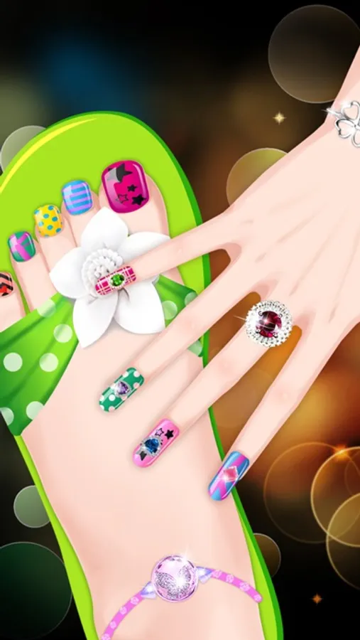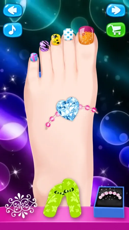 Foot Nail Spa takes you into the day spa where you can treat feet to make them feel soft and new and clean. You can be an artist and make a design that will WOW everyone! With TONS of options to choose from you can pick your favorite color and paint it directly on the nails! There are so many different kinds of decorations to choose from...Gems, Flower stickers, Sparkles, Patterns and Shapes, and so much more!
