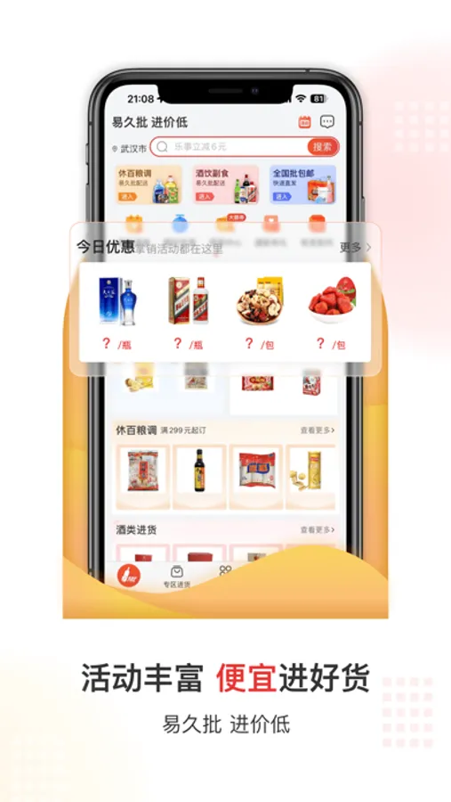 批发就用“易久批”!易酒批电子商务有限公司提供的第三方线上全品类批发平台,全国各品类商品批发价格,尽在“掌”握。一键下单,送货上门,由易久批提供质量担保。
