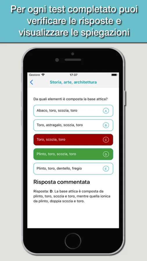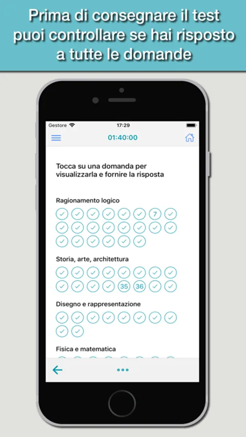 The app is designed to simulate as close as possible the test you actually have to deal with, with all the topics of the test: logical skills and general knowledge, history, arts and architecture, technical design, physics and mathematics.
