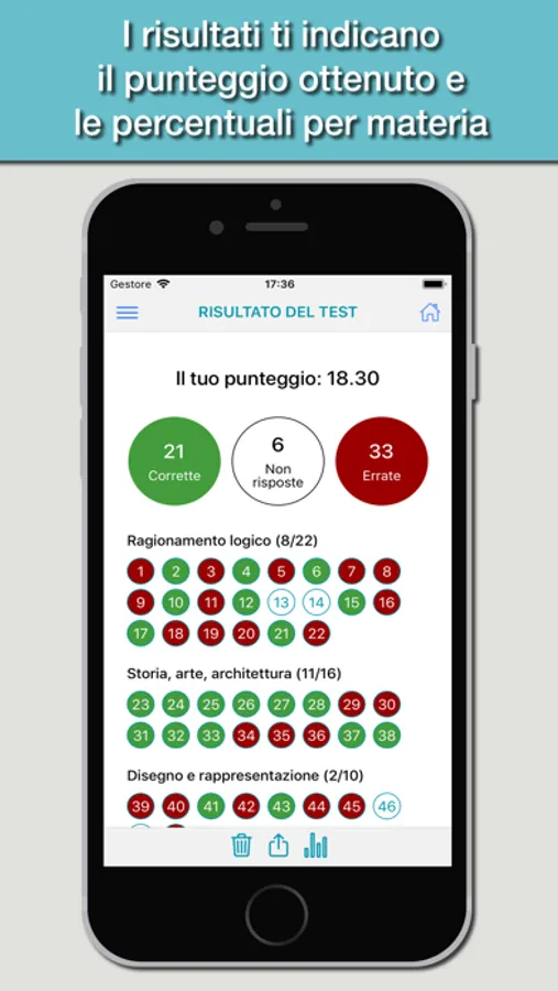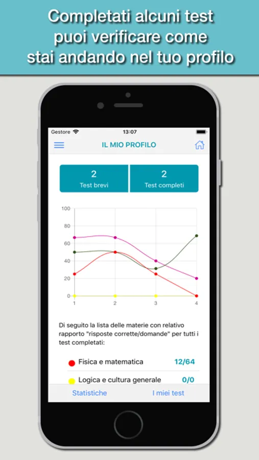 Once you have completed a series of short or complete tests, you can access your profile and visually check the progress of your preparation and deepen the topics of the tests by viewing the commented answers.
