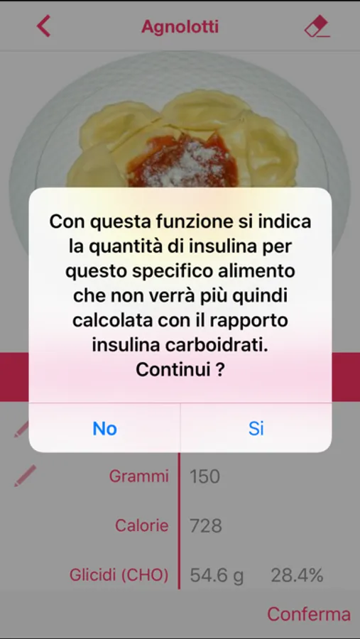 Cambiando la quantità dell'alimento assunto, la dose insulinica equivalente mostrata viene variata.