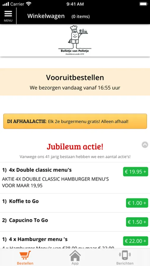 Download onze app en blijf op de hoogte van het laatste nieuws en de nieuwste acties, aanbiedingen en kortingen. Via onze app kunt u onze menukaart bekijken en direct vanaf uw telefoon uw bestelling plaatsen. U kunt via de app ook met iDEAL betalen!
