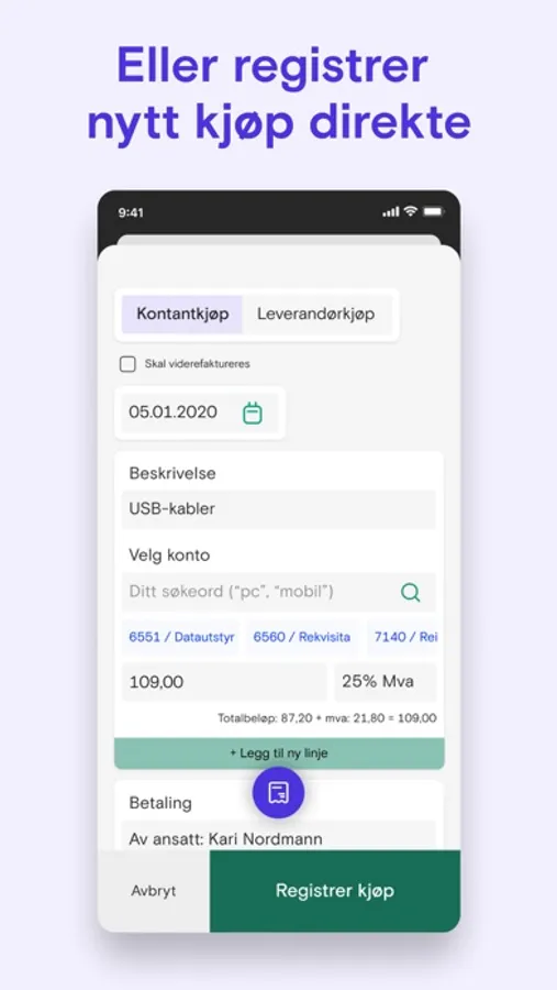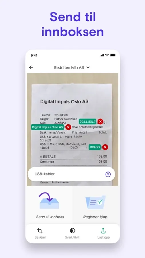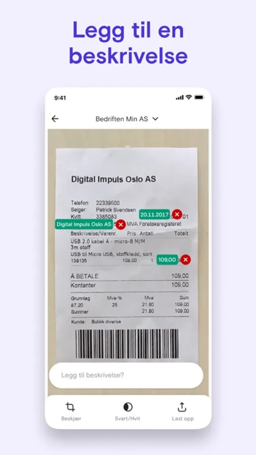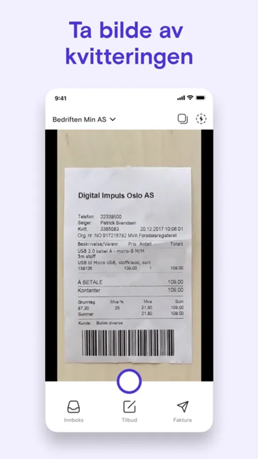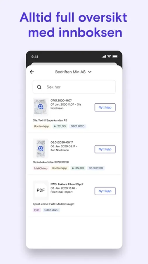 Utgifter er sjelden gøy, men hos oss er de i hvert fall enkle å bli ferdige med: Bruk appen vår til å kvitte deg med kvitteringene dine i en fei! Ta bilde, registrer kjøpet med det samme, eller send det til innboksen din, og gjør det når det passer deg.
