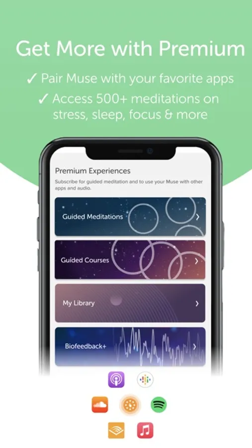 Subscribers gain access to Muse Biofeedback+ & over 500 Guided Meditations from renowned meditation instructors including collections like sleep, performance, stress, and more.