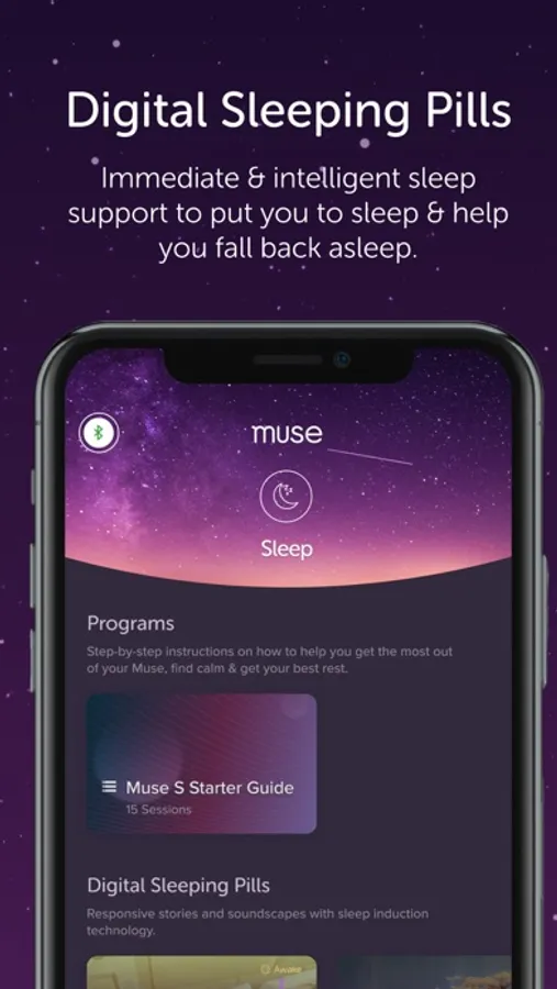 Muse’s Sleep Experiences include Overnight Sleep Tracking and Digital Sleeping Pills or ‘DSPs’. DSPs use smart-fade technology that gently modulates your auditory experience to help you fall asleep and fall back asleep if you’ve woken up during the night. You’ll also have access to Sleep Journeys, Guidances, and Soundscapes which do not include smart-fade technology.