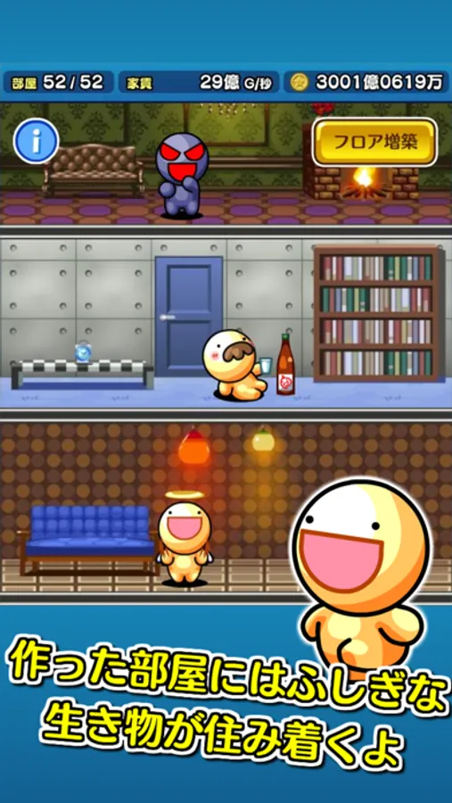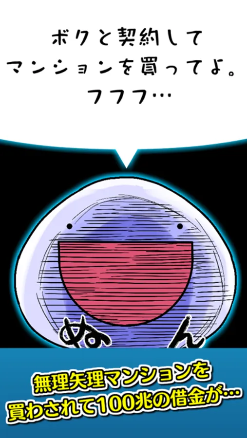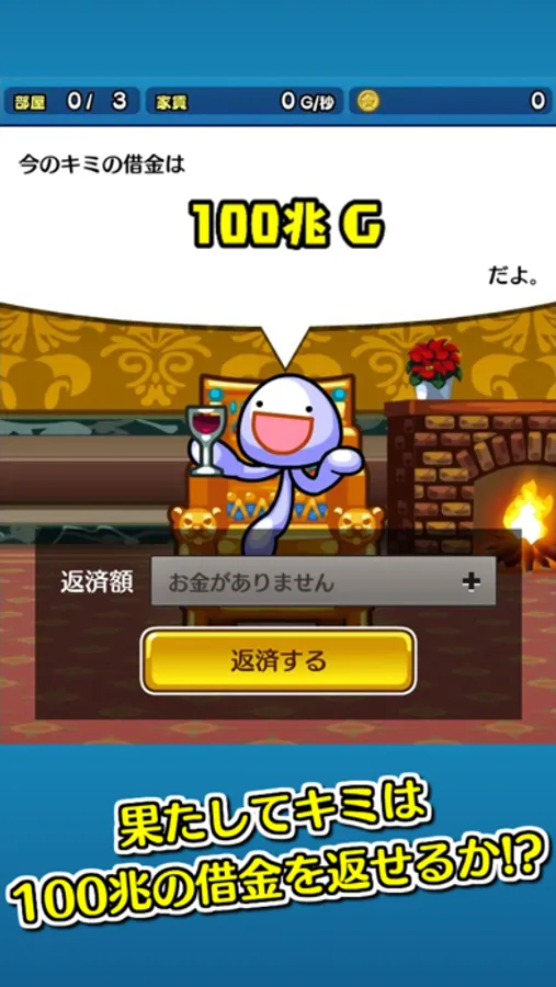 このゲームは、自称セレブのあやしい生き物「クラゲふにゃ」から無理矢理マンションを売りつけられ、100兆の借金を負ってしまったあなたが主人公です。マンションを経営して借金を返しましょう。