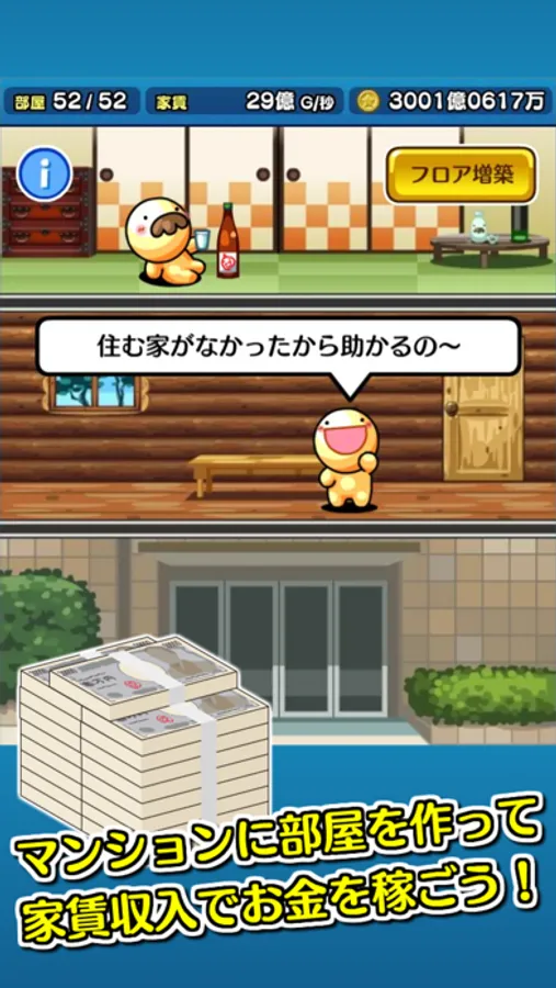 マンション経営というと難しそうだけど、簡単操作でちょっとした空き時間に遊べる放置ゲームです。