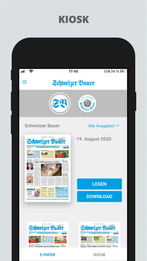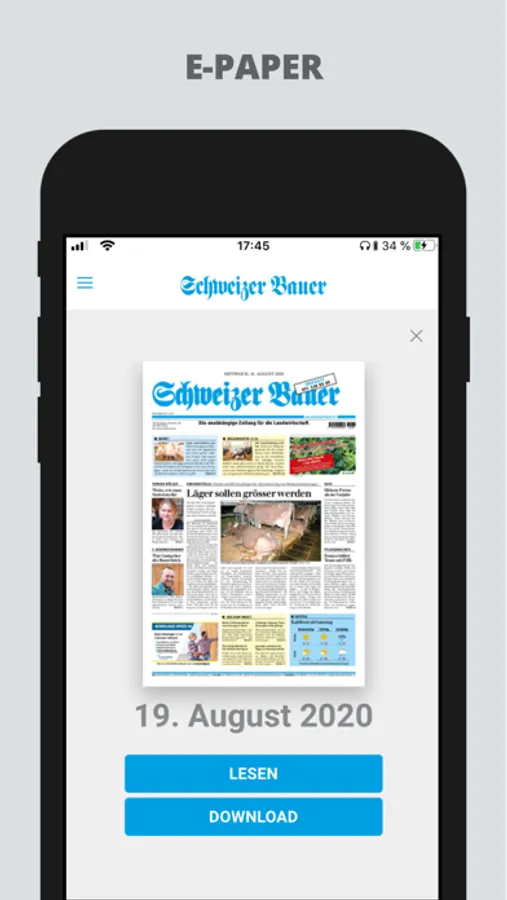 Die grösste Agrar-Zeitung der Schweiz ist jetzt auch als digitale Ausgabe verfügbar. Als Abonnent lesen Sie den Schweizer Bauer bequem auf Ihrem iPad. Am Erscheinungstag können Sie sich bereits ab Mitternacht die neuste Ausgabe des Schweizer Bauer herunterladen. Einmal geladene Ausgaben bleiben auf dem Gerät gespeichert und lassen sich auch ohne Internetzugang jederzeit wieder lesen. Sie haben uneingeschränkten Zugang auf sämtliche bisher erschienenen Ausgaben seit dem Start des ePapers im Jahr 2011. Zudem steht Ihnen eine mächtige Suchfunktion zur Verfügung, womit sich das Archiv bequem nach Stichwort durchsuchen lässt. Um das neue Angebot nutzen zu können, benötigen Sie ein ePaper-Abonnement des Schweizer Bauer. Für alle Abonnenten der gedruckten Zeitung ist das ePaper-Angebot kostenlos nutzbar.