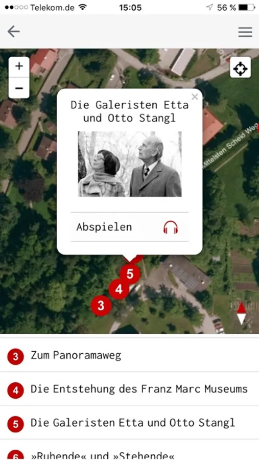 Im Franz Marc Park und auf dem weiterführenden Panoramaweg können Sie mit Hilfe der App einer Führung zur Geschichte des Museums, zu seiner Leitidee, dem Dialog zwischen Kunst und Natur und zu den im Park aufgestellten Skulpturen folgen. Auf einer Orientierungskarte lassen sich Hörstücke mit einer Gesamtlänge von etwa 30 Minuten auswählen. Über den Panoramaweg erreicht man nach etwa 500 Metern eine kleine Anhöhe. Dort lässt der weite Blick in die Ebene die Inspiration des „Blauen Reiters“ durch die Natur nachempfinden.
