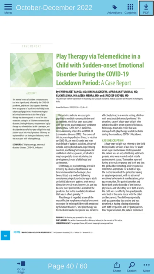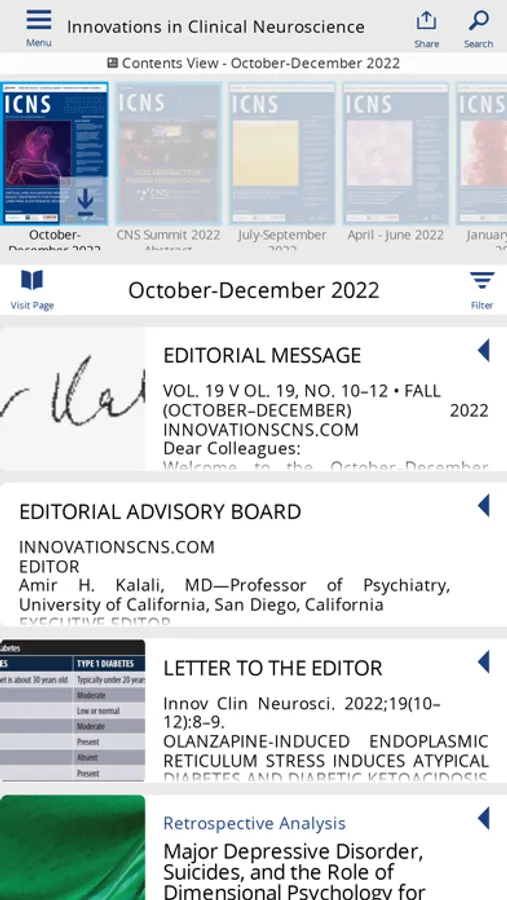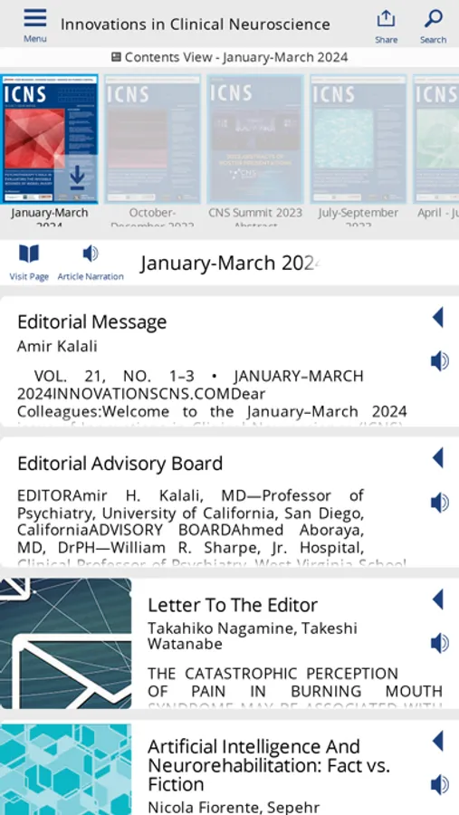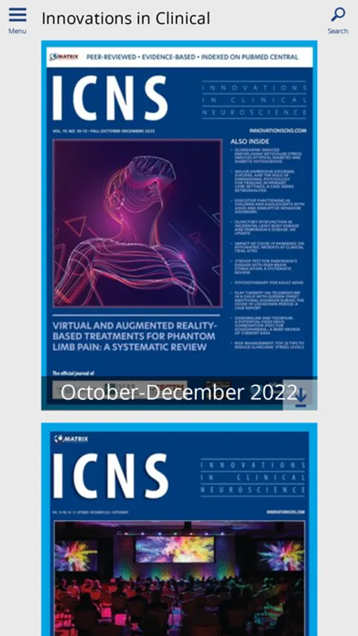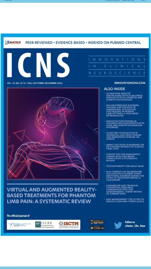 Innovations in Clinical Neuroscience (ICNS) is a peer-reviewed, electronic publication that has become an important addition to the field of neuroscience. Under the expert editorial leadership of Amir Kalali, MD, ICNS provides evidence-based information in a practical, easy-to-read format for practicing clinicians, investigators, industry scientists, and other entities involved in the field of neuroscience. ICNS translates the vast amounts of CNS research into applicable information that aims to inform practicing clinicians on the latest treatment options in psychiatry and neurology, as well as investigators and scientists on the latest innovations in the drug development arena. ICNS offers its readers original research, practical discussions on the latest research, comprehensive reviews, brief reports on important, but limited data, didactic case reports, and provocative commentaries on contemporary topics in neuroscience. Articles are—written by key opinion leaders as well as practicing clinicians who are “in the trenches, —providing vital balance to the research-rich literature that is already available. ICNS is published by Matrix Medical Communications in West Chester, Penn., USA, and is indexed on PubMed Central, PsycINFO, CINAHL Plus with Full Text, Scopus, and EMBASE.