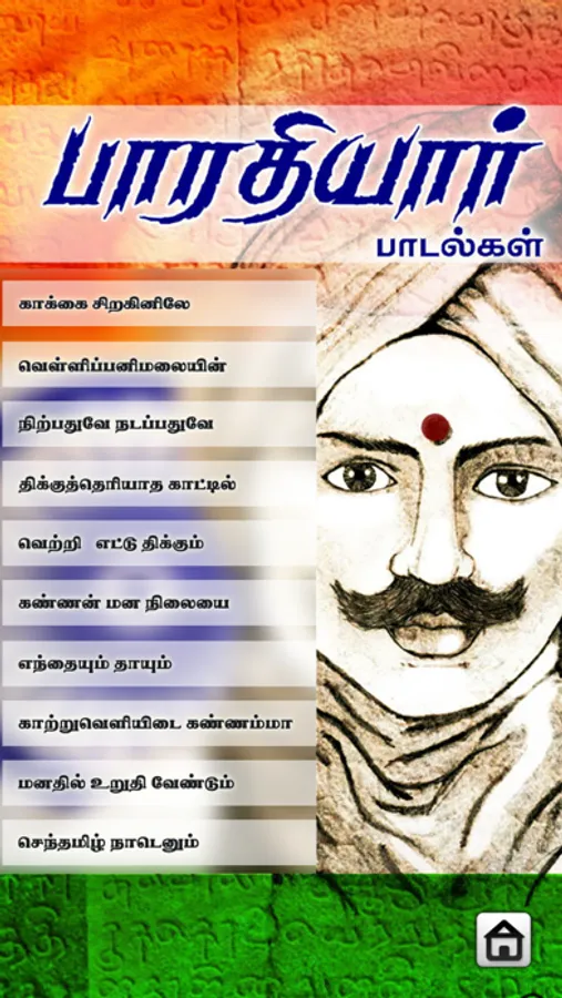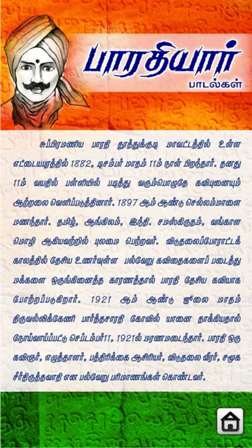 Mahakavi Bharathiyar is one of South India’s greatest poets. His patriotic songs emphasize nationalism, unity of India, equality of men and the greatness of Tamil language which earned him title “Desiya Kavi” (National Poet). Here We have presented some of Bharathiyar’s song.