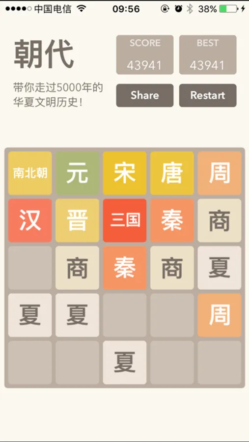 2048朝代版玩法和2048数字版一样,可以选择上下左右其中一个方向去滑动,不同的是将数字变成了中国自夏开始的各个朝代,就是两个夏拼成一个商,两个商拼成一个周...每次碰撞后便生成下一个朝代,以此类推直到中华人民共和国完成通关。
