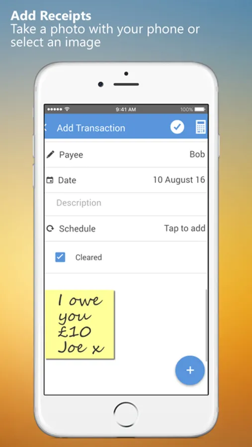 Do you want to see your receipt on your computer? Take a picture of your receipt and attach to your transaction. Synchronize the mobile app with the desktop application and see your receipt added to your transaction on your computer.