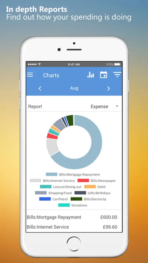 We provides bar and pie charts, which give you an accurate picture of your total expense, income or balance for the month, week and more. Stay on top of your money.