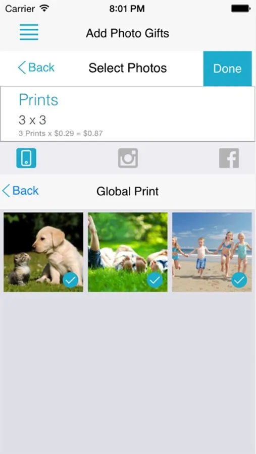 - Prints of different sizes (3x4, 4x6, 5x7, 8x10) including squares (3x3, 4x4, 5x5, 8x8, 10x10, 12x12) to match you Instagram photos