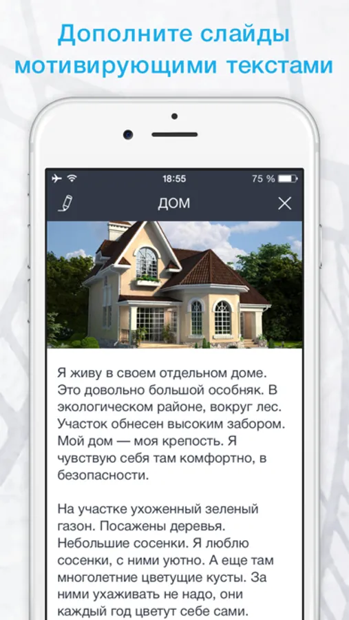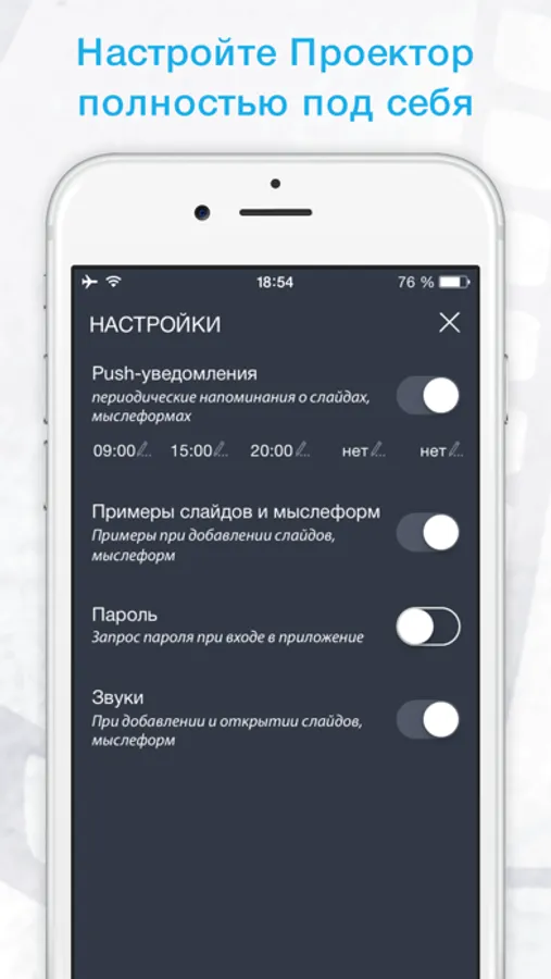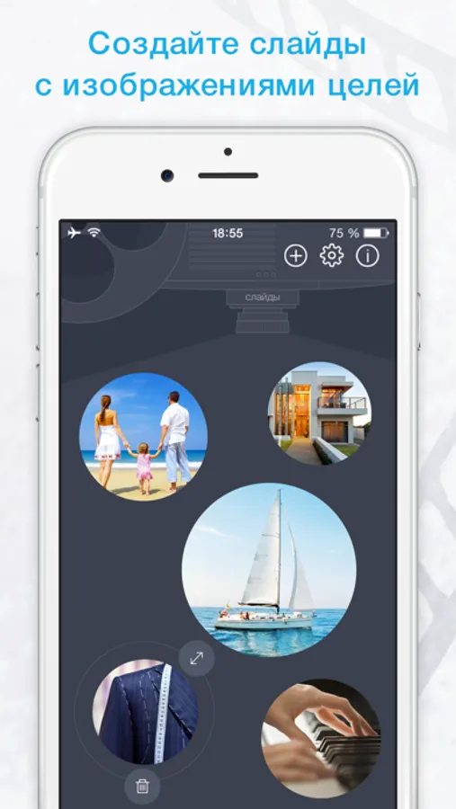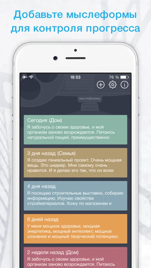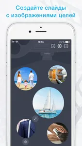 Для удобства пользователей в приложении предоставляется множество примеров формулировок целей (слайдов), а также ежедневных подтверждений (мыслеформ). Можно создать слайд какой угодно темы либо выбрать из имеющихся: