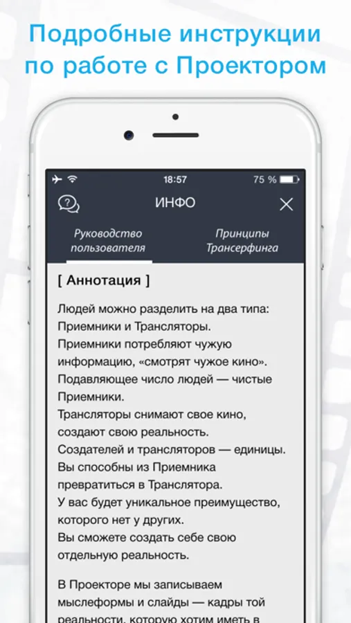 В разделе «Инфо» вы найдете подробное Руководство пользователя и сжатое описание основных принципов Трансерфинга, а при первом запуске приложения вас ждет краткая инструкция по использованию приложения.