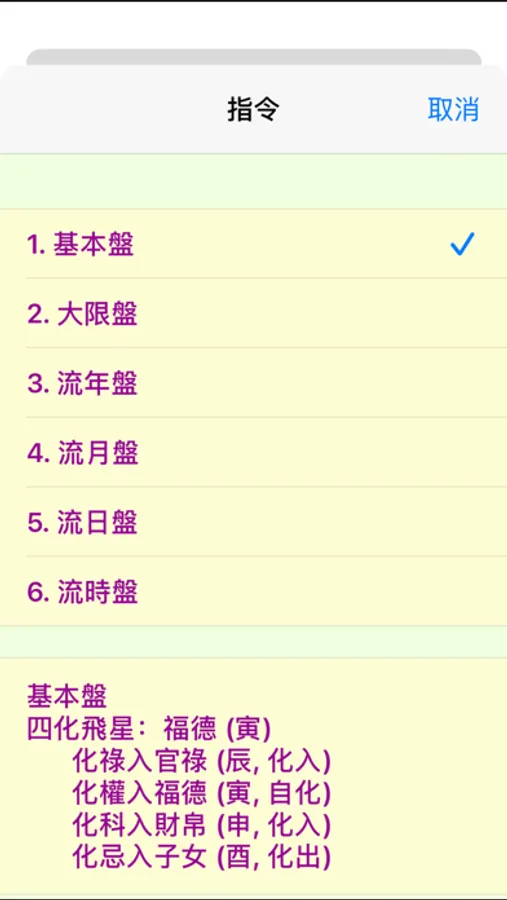 5.「本命盤」顯示本命生年四化星。「大限盤」顯示大限四化星,能依不同大限選擇顯示相對的大限四化星。「流年盤」,「流月盤」,「流日盤」和「流時盤」顯示各流年流月流日流時四化星,能依不同流年流月流日流時選擇顯示相對的四化星。