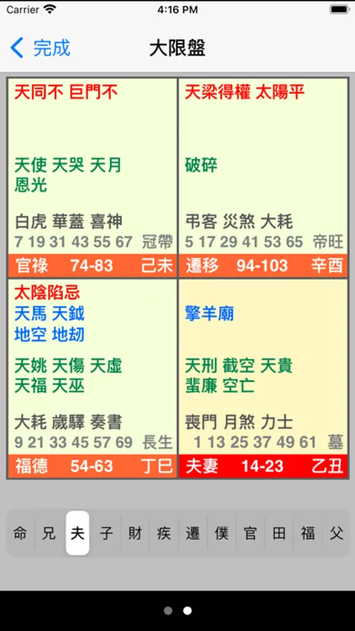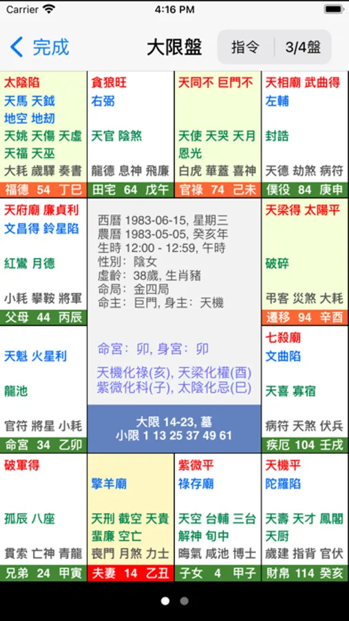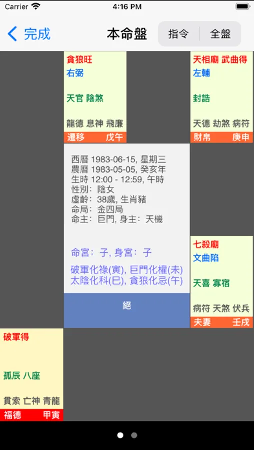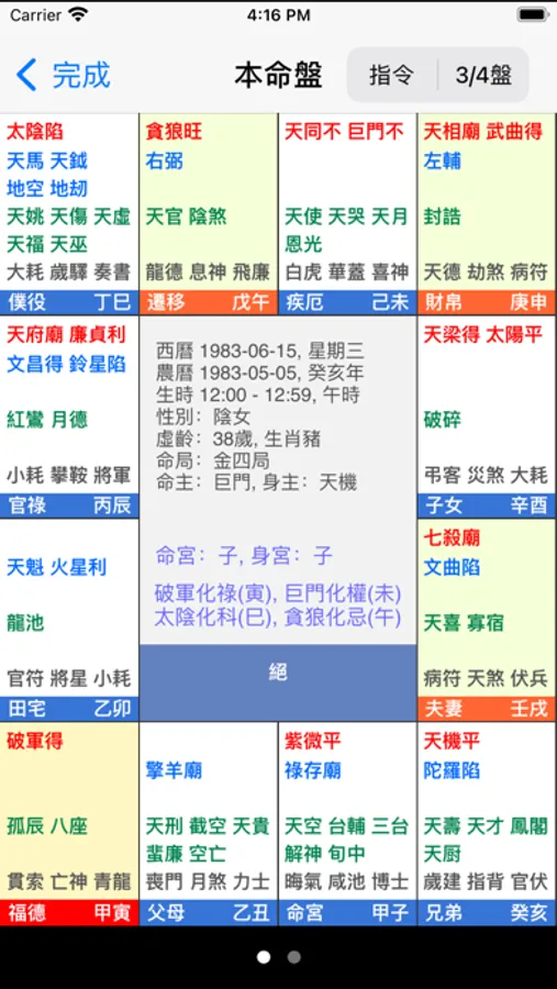 2. 當本程式排盤,顯示全盤後,用戶可以用手指在宮位上按一下,程式便顯示三方四正,使用戶能容易看全盤顯示。