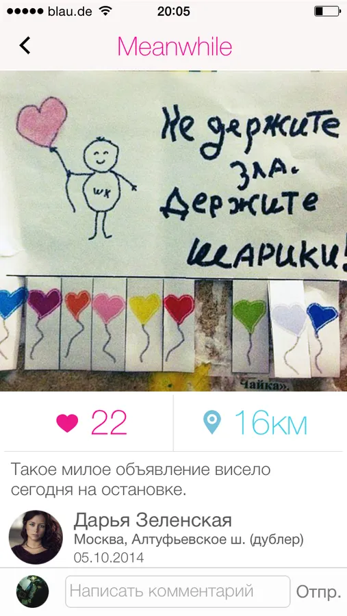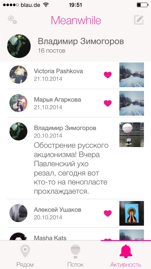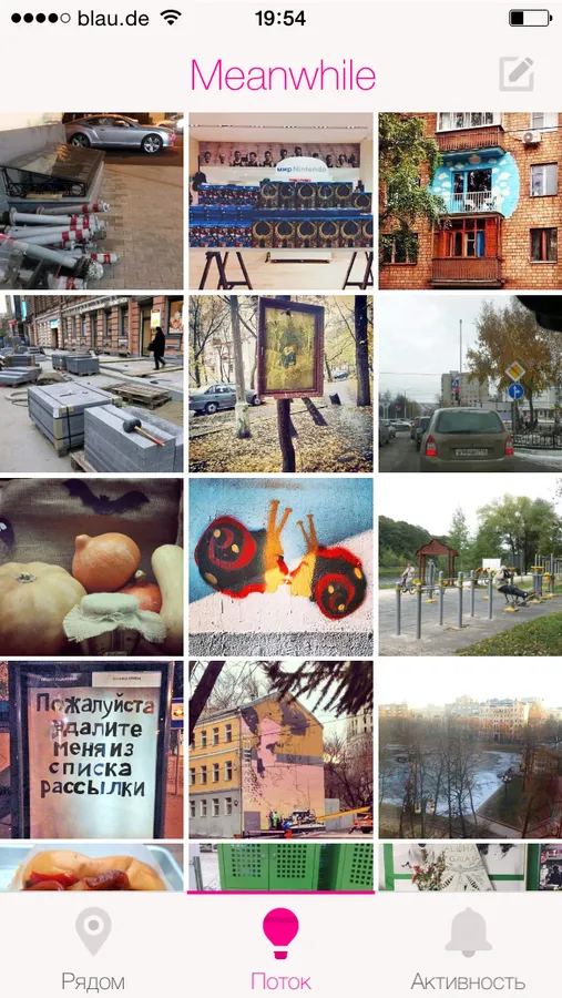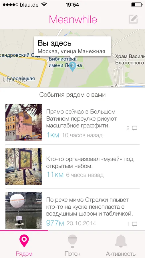 Вместе с Meanwhile вы всегда будете в курсе всего, чем живет город прямо сейчас - флешмобы и уличные фестивали, ярмарки и субботники, митинги, акции или даже просто открытие нового уютного кафе или начало распродажи в любимом ТЦ. Оставайтесь в гуще важных событий и новостей, узнавайте первыми о новых интересных местах, будьте частью жизни большого города!