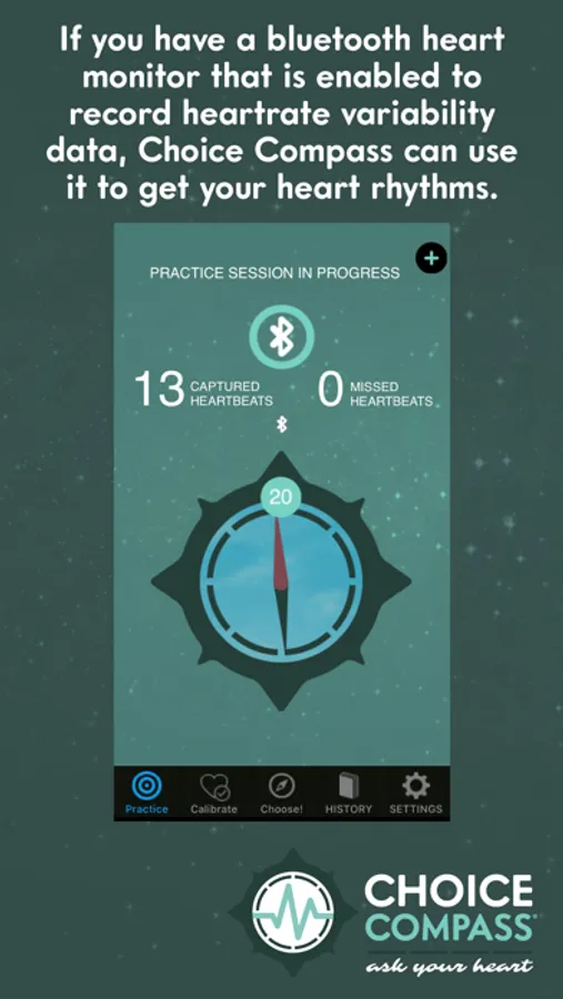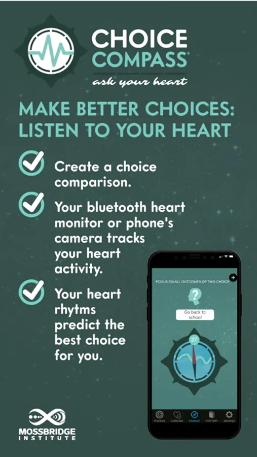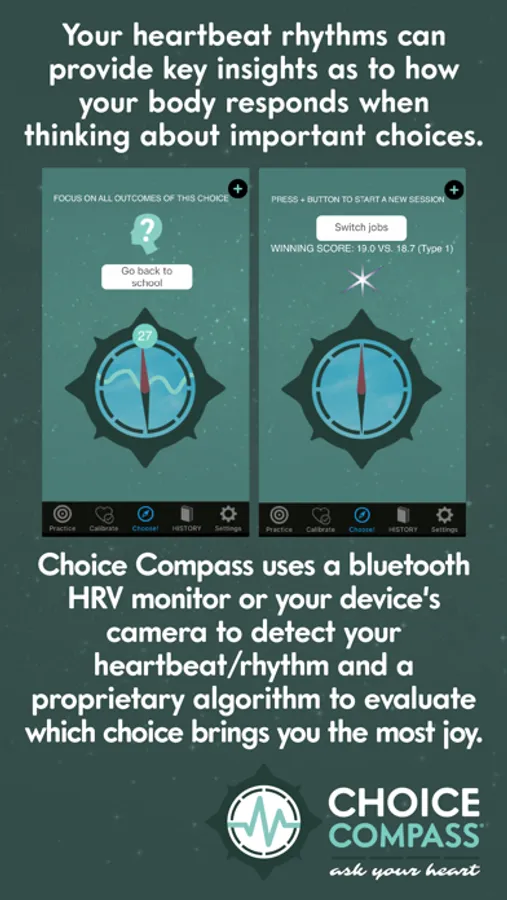 Choice Compass helps you by analyzing changes in your heart rhythm that occur as you concentrate on 2 choices you are considering (like: “stay here” versus “move”). The app then reports which decision is closer to the heartbeat dynamics associated with positive, rather than negative choices.