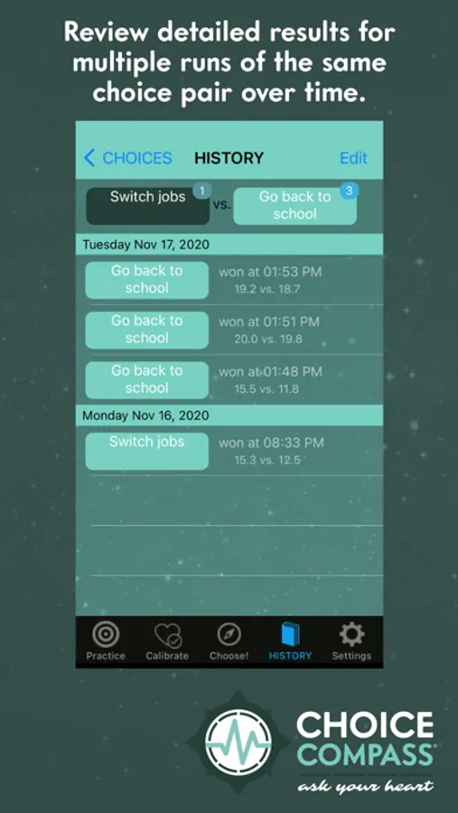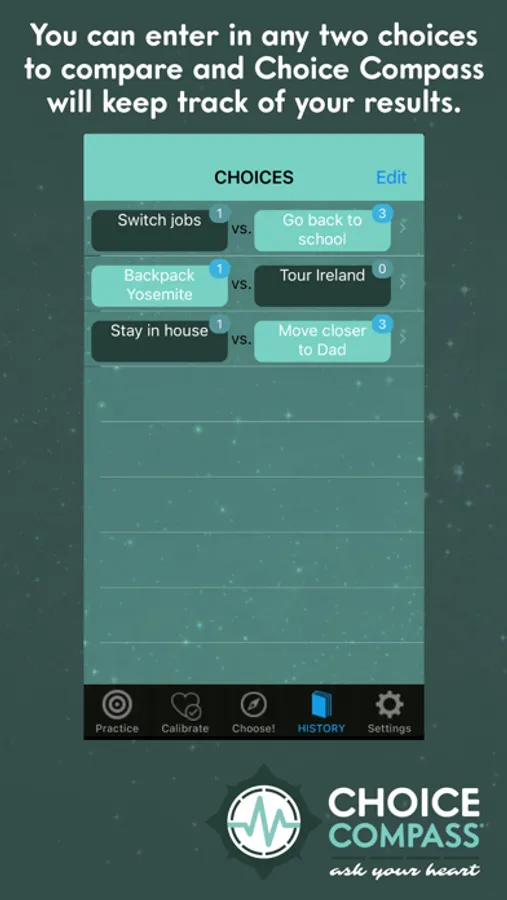 Choice Compass is a scientifically tested decision making app that uses a patented method to access the mind-body process of decision making to help you make a more informed decision by literally "listening to your heart."